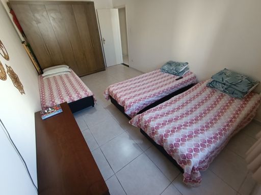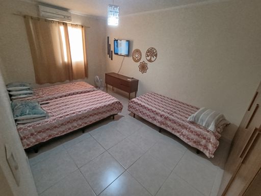 Quarto 2 : Bem espaçoso - Configurado atualmente com três camas de solteiro, um guarda-roupa amplo em madeira, TV própria e unidade de ar-condicionado