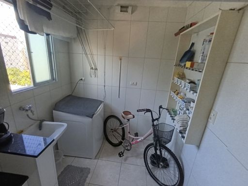Área de serviço ampla: Independente e icom acesso pela cozinha, possui tanque, máquina de lavar roupas, varal de teto e prateleiras para produtos de limpeza.
