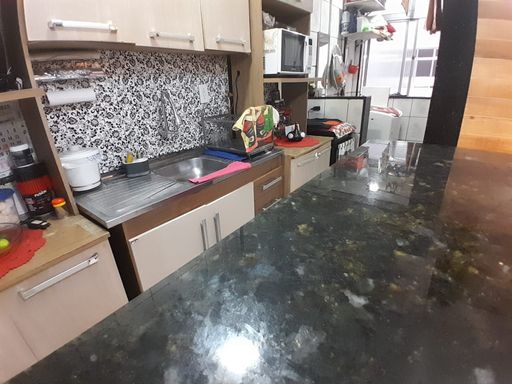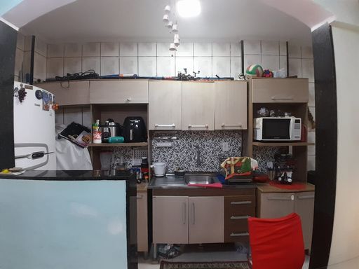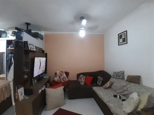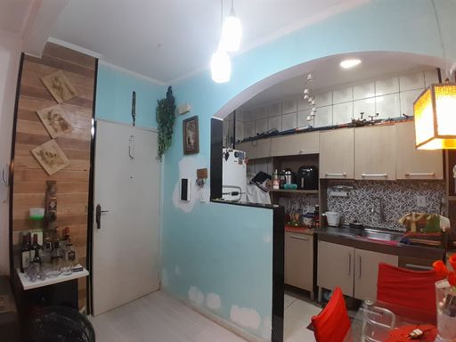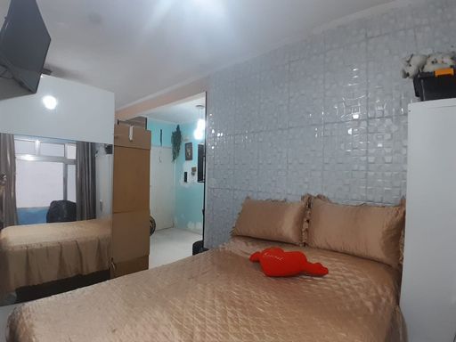 Apartamento com planta flexível, feita divisão de espaço de dormitório e sala de estar conectada à cozinha americana.